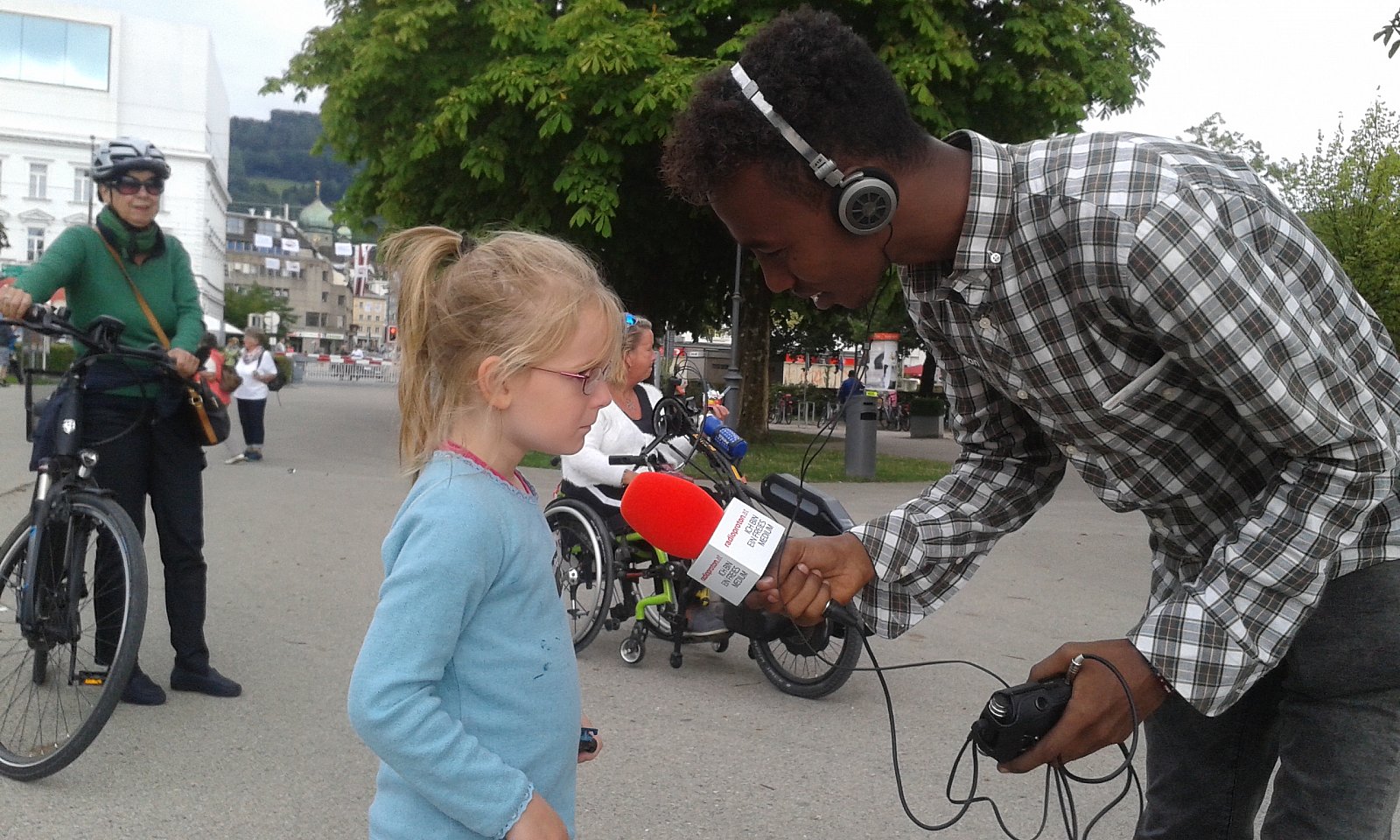 Friedensengagierte aus Somalia, Afghanistan, Irak, Griechenland, Bosnien, Österreich und der Schweiz lernten bei Proton - das freie Radio den Umgang mit Radiotechnik und überlegten sich wie die Interviewtage gestaltet werden können, sodass wirkungsvolle Begegnungen und Gespräche entstehen können. Das Team hat insgesamt rund 120 berührende Interviews mit PassantInnen und Verweilenden an öffentlichen Plätzen geführt. Darüber hinaus haben wir auch ausgiebige Interviewdialoge mit sogenannten FriedensbürgermeisterInnen geführt.